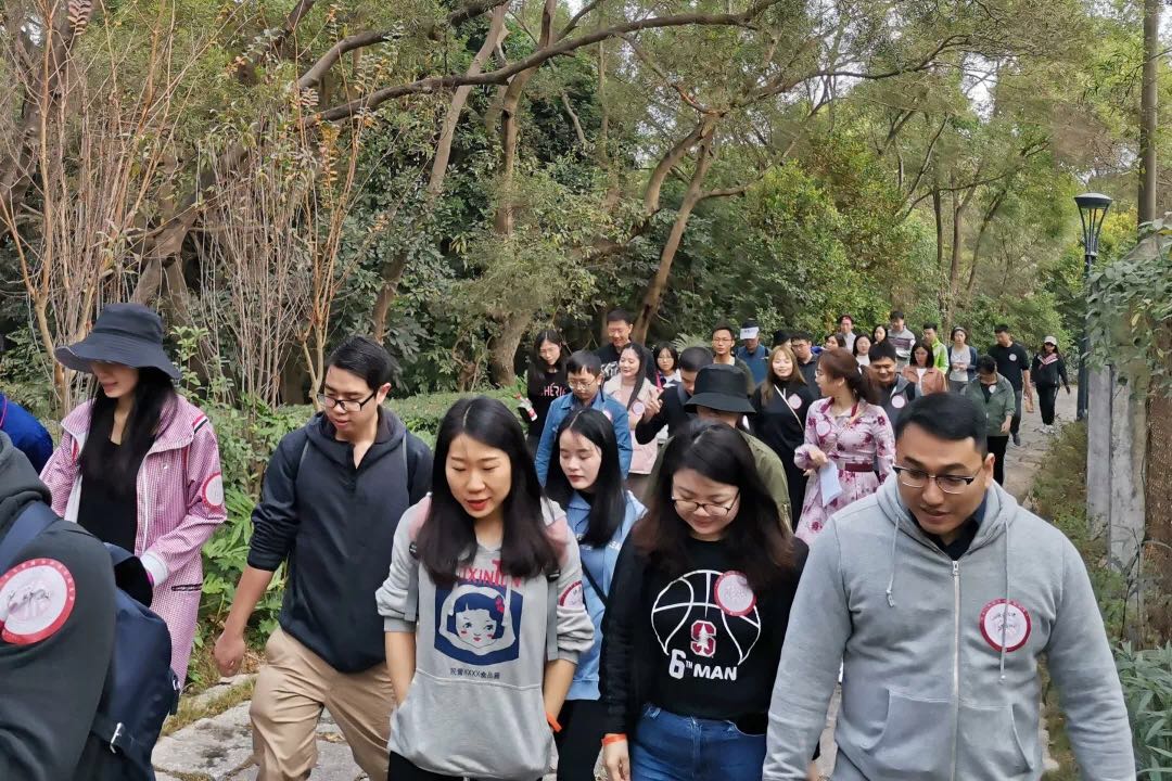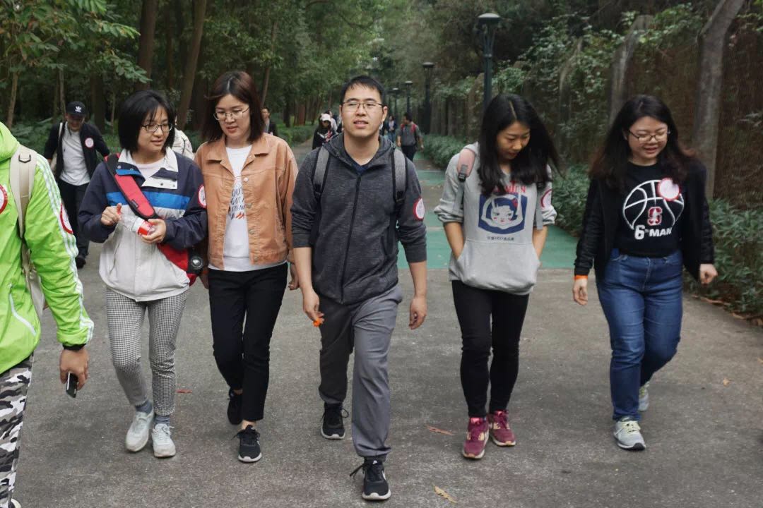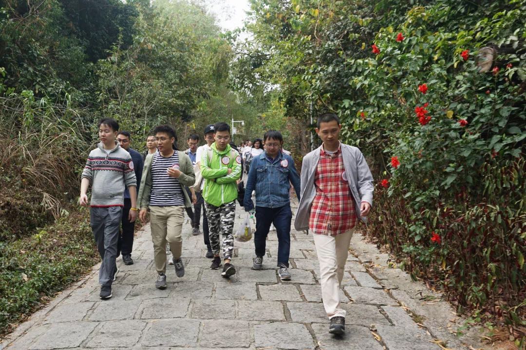 早上9:00,大家准时集合,领取姓名贴和代表不同年级的各色手环,开始“长岭陂—梅林水库”绿道徒步活动。为了促进各年级校友间的互相交流,不同年级校友被打乱编为5组,每组由在校生志愿者带队,参与活动的老师们也在各组流动交流。