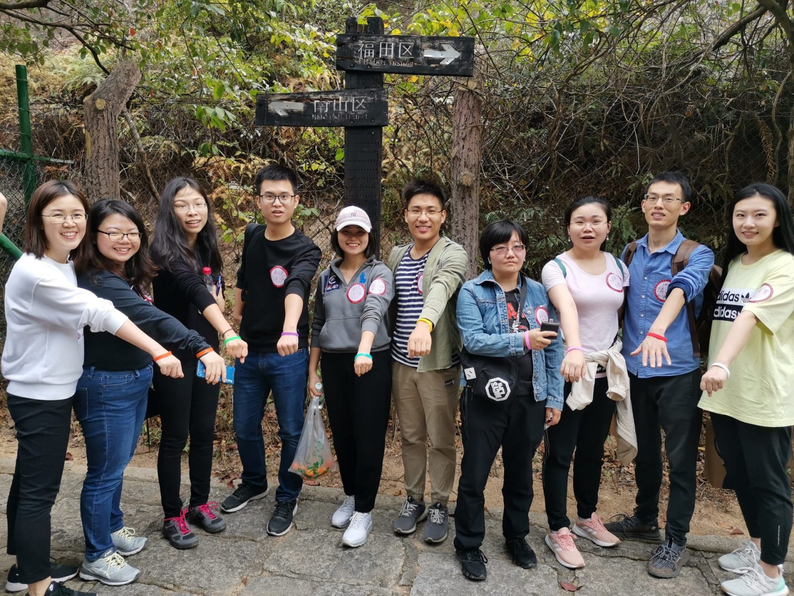 为了增强趣味性,本次徒步活动还设置了游戏环节,拥有8种不同颜色的手环的校友在“南山区”和“福田区”分界的路标处拍摄笑脸合照即为完成任务。游戏环节得到了校友们的热情参与,大家在打卡点拍摄了一组组美好照片,记录下了这一欢聚时刻。