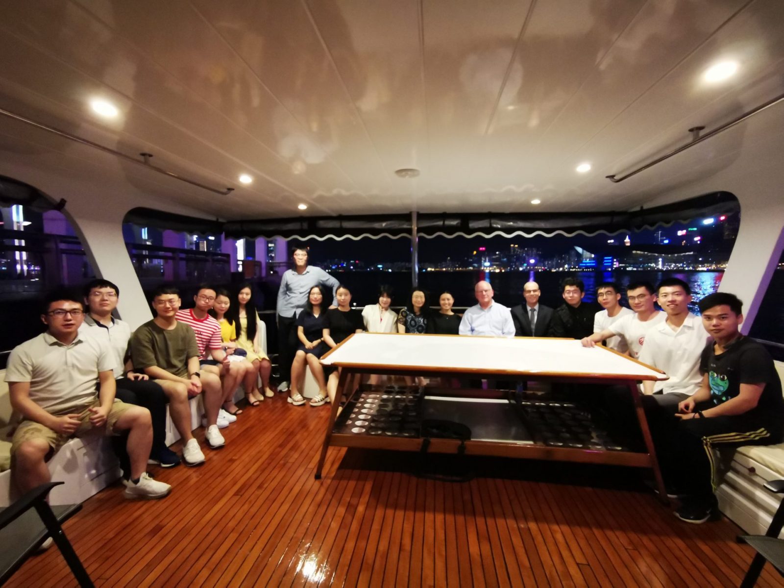 在PILF上和Professor Frayn, Professor Reda合影,黄永康拍到了他们的“罗德岛Providence一日游”拍品还有就是19年6月份香港的“维港友谊”小船,这个好像就出自院长在18年PILF上的拍品。院长带大家去香港租了一条船,大家就一起在船上看维多利亚港的夜景,吃自助,喝一点酒。当时去的professors有很多,不光是有院长本人,还有曹老师, Professor Joy Xiang,Professor Friedmann,各个年级的同学也很多。在微醺中聆听教授们的经验分享并感受维港的凉风,欣赏绚烂的维港夜景,日后定会成为非常美好的回忆。