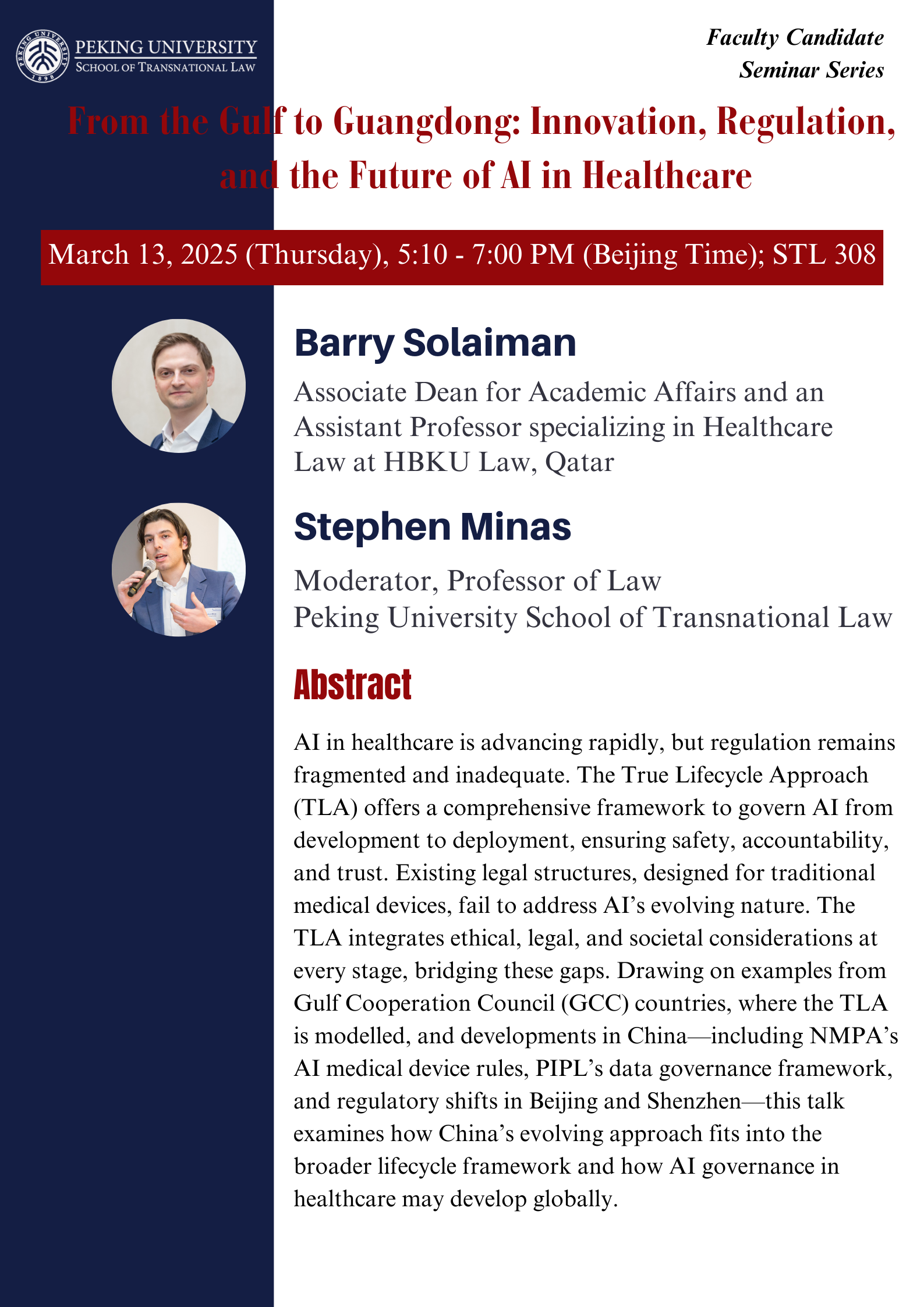 3月13日,北京大学国际法学院(英文简称“STL”)公开讲座“From the Gulf to Guangdong: Innovation, Regulation, and the Future of AI in Healthcare”将于国际法学院大楼308教室举行,欢迎感兴趣的师生积极到场参加!具体信息如下: