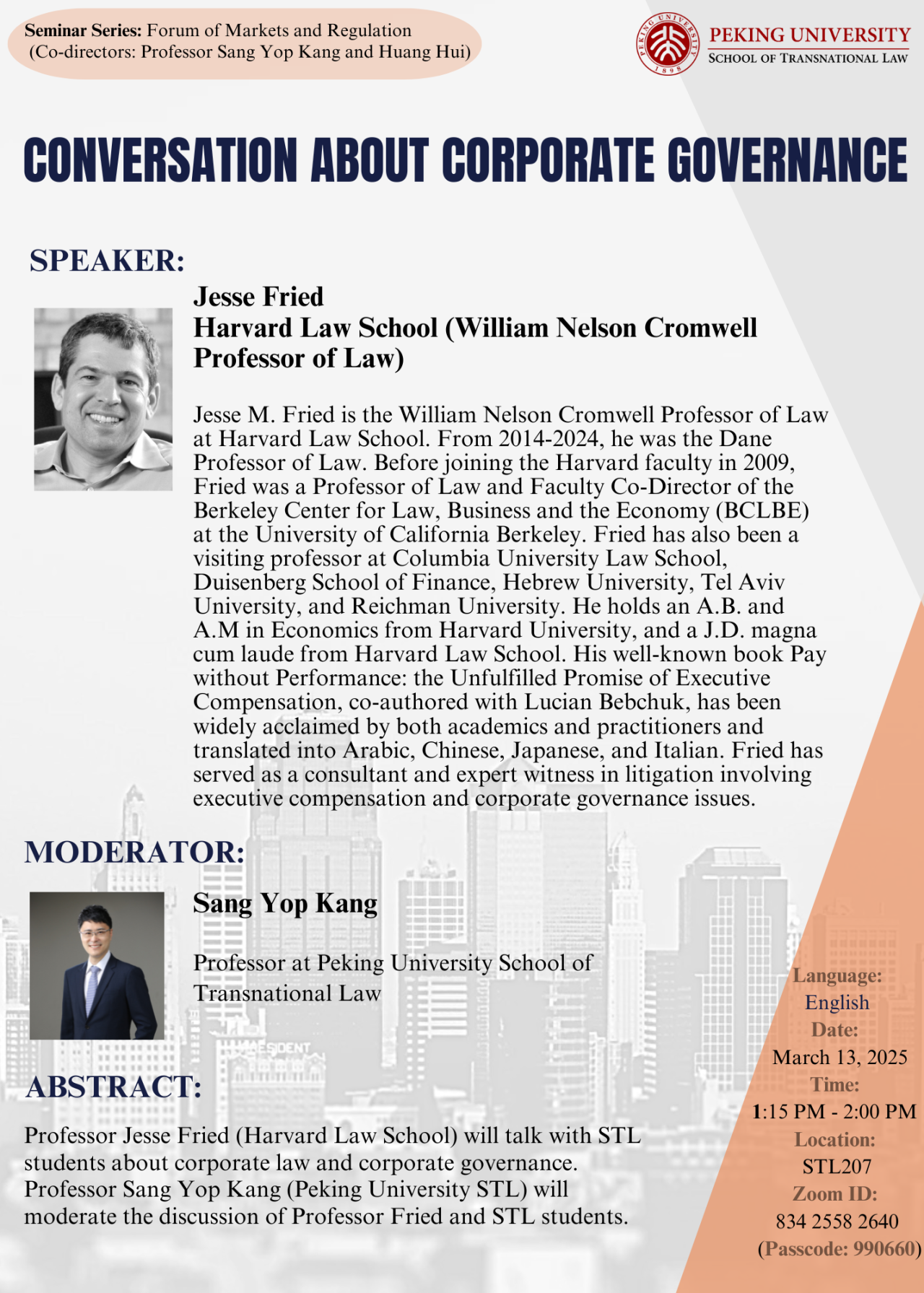 3月13日,受北京大学国际法学院(英文简称“STL”)邀请,Professor Jesse Fried将于我院举办主题为“Conversation about Corporate Governance”的公开讲座,欢迎感兴趣的师生积极到场参加!具体信息如下: