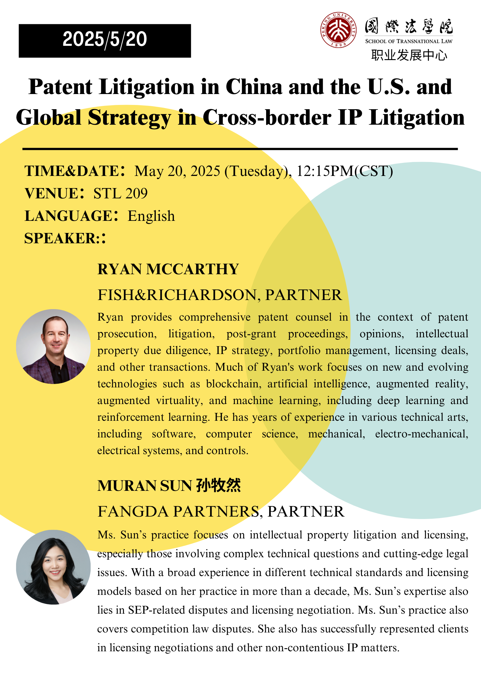 5月20日,受北京大学国际法学院(英文简称“STL”)就业办邀请,FISH&RICHARDSON合伙人Ryan McCarthy与方达律师事务所合伙人孙牧然将于我院举办主题为“Patent Litigation in China and the U.S. and Global Strategy in Cross-border IP Litigation”的讲座,欢迎感兴趣的师生积极参与!具体信息如下: