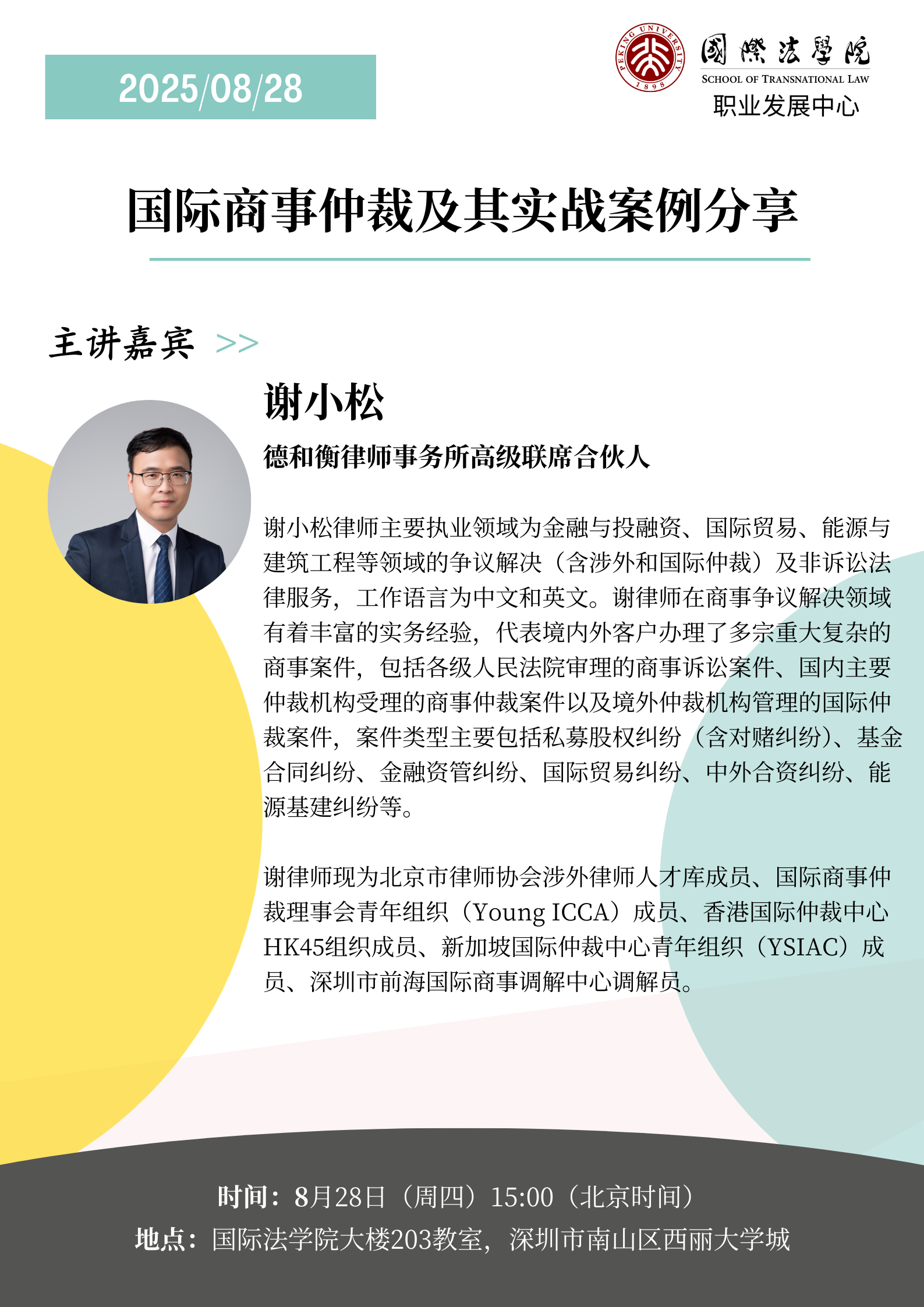 8月28日下午,就业办邀请到德和衡律师事务所高级联席合伙人谢小松律师来到我院,为大家带来一场“国际商事仲裁及其实战案例分享”专题分享,这是我们本学期走近实务系列首场活动,谢律师将结合自身工作经历和具体案列与大家分享他在国际商事仲裁领域的经验和见解,并就相关职业规划问题与大家一同交流。欢迎同学们积极参加!