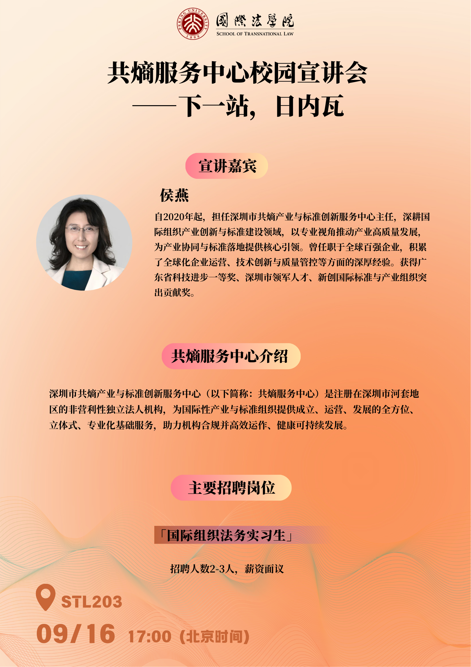 9月16日下午5点,深圳市共熵产业与标准创新服务中心将来到我院,在国法203教室举办校园宣讲会。深圳市共熵产业与标准创新服务中心(以下简称:共熵服务中心)是注册在深圳市河套地区的非营利性独立法人机构,为国际性产业与标准组织提供成立、运营、发展的全方位、立体式、专业化基础服务,助力机构合规并高效运作、健康可持续发展。本次宣讲主要招聘国际组织法务实习生,欢迎同学们关注,积极参加宣讲。