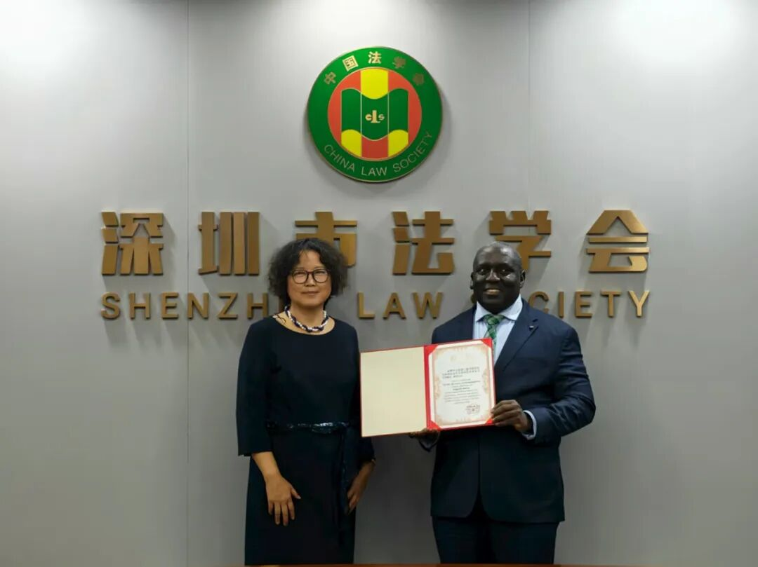 研讨活动后,深圳市法学会涉外法治研究会会长,北大国际法学院教授,区域与国别法研究中心主任黄卉向Seemogerere 大法官颁发了研究会学术顾问聘书,Seemogerere大法官表示了感谢并热情允诺将持续积极推动中乌两国在法律领域的合作,并期待深圳法律同仁访问乌干达以拓展和巩固本次交流的成果。