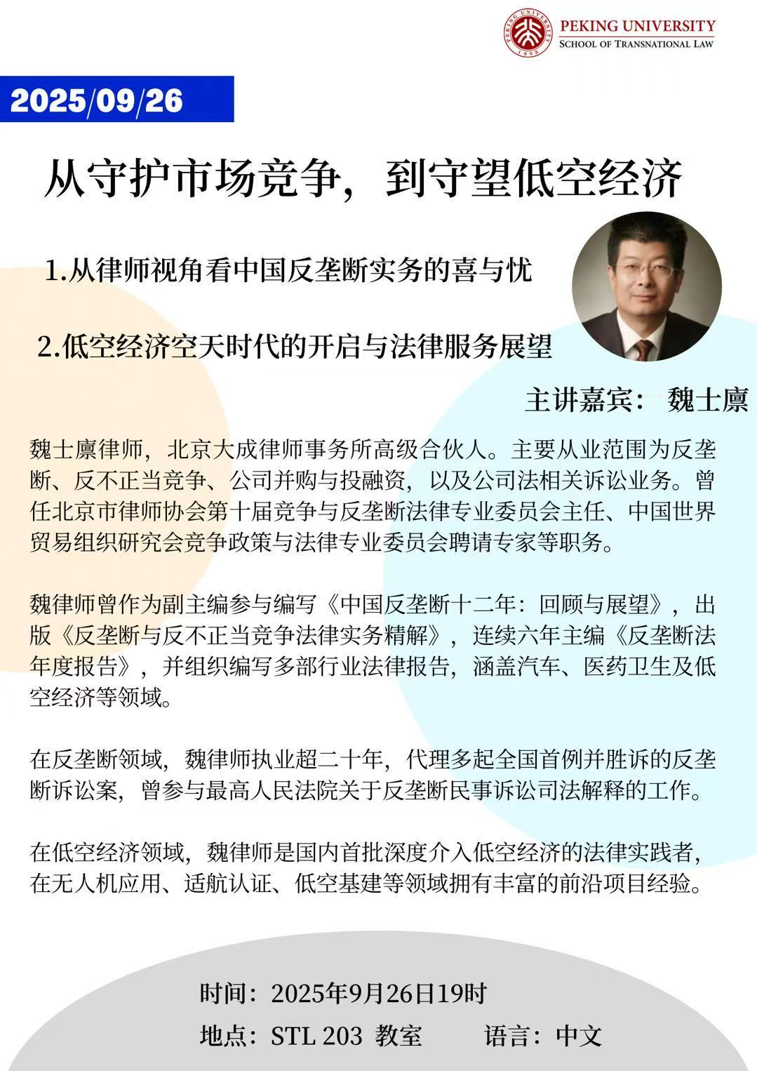 9月26日,受北京大学国际法学院(英文简称“STL”)邀请,北京大成律师事务所高级合伙人魏士廪律师将于我院举办主题为“从守护市场竞争,到守望低空经济”的公开讲座,欢迎感兴趣的师生参与!具体信息如下: