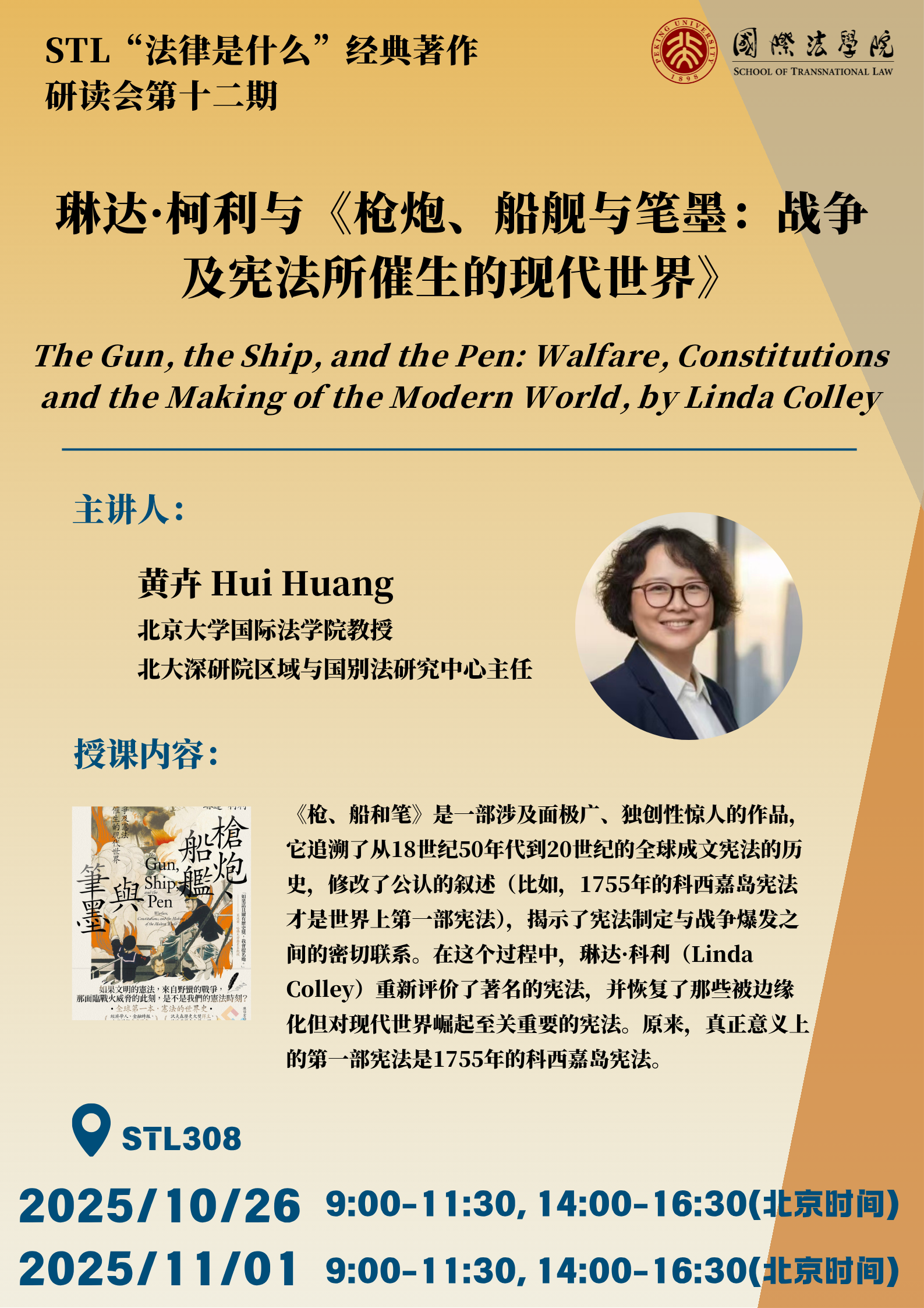 10月26日及11月1日,由我院黄卉教授主持的STL“法律是什么”经典著作研读会第十二期将带来主题为“琳达·柯利与《枪炮、船舰与笔墨:战争及宪法所催生的现代世界》”的分享,欢迎感兴趣的师生参与!具体信息如下: