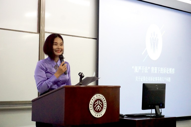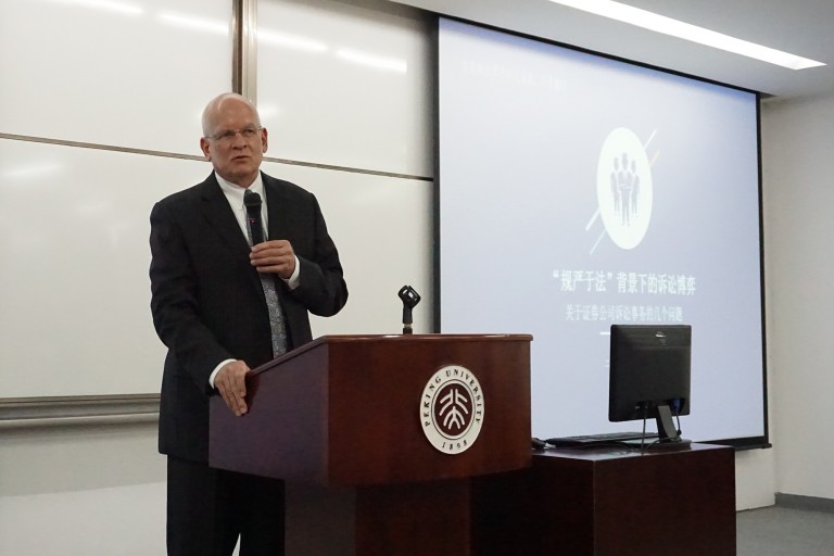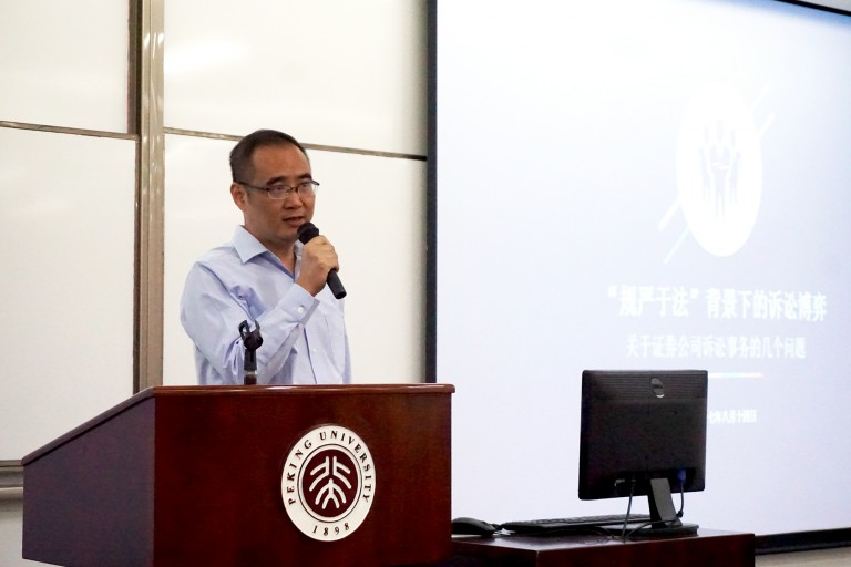 国际法学院院长Philip McConnaughay欢迎各位律师参观北大国际法学院,介绍了国际法学院的教学特色,并对研讨会的成功举办表示祝愿。周璇主任对与会人员表示欢迎和感谢,并在发言中提出,金融领域是法律业务创新工作中最活跃的领域,证券合规诉讼法律业务已成为广大律师新的业务增长点,值得广大律师从证券公司角度、投资者角度等来深入了解和研究此类创新型法律业务。随后,汪成接先生作了“‘规严于法’背景下的诉讼博弈”的专题分析,主要讲述了证券公司诉讼事务的特点、证券合规诉讼案件的应对之道以及几个值得关注的诉争问题。刘思远律师带来了“证券虚假陈述诉讼案件实务技巧”的专题分享,主要讲述证券虚假陈述诉讼案件的基本情况、法律要点、法律难点及发展动态。