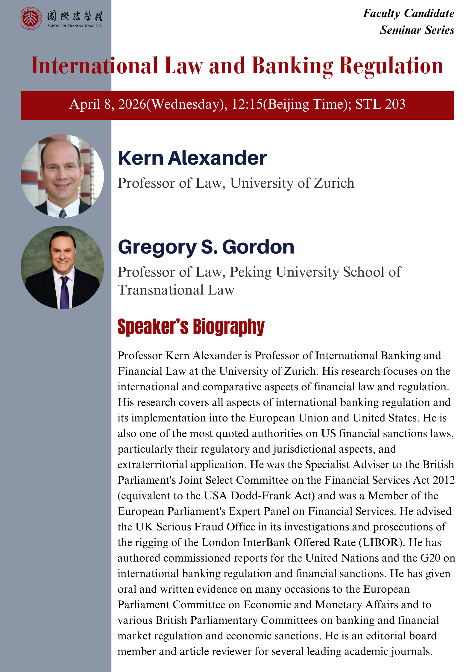 4月8日,北京大学国际法学院(英文简称“STL”)公开讲座"International Law and Banking Regulation" 将于国际法学院大楼203教室举行,欢迎感兴趣的师生积极到场参加!具体信息如下:
