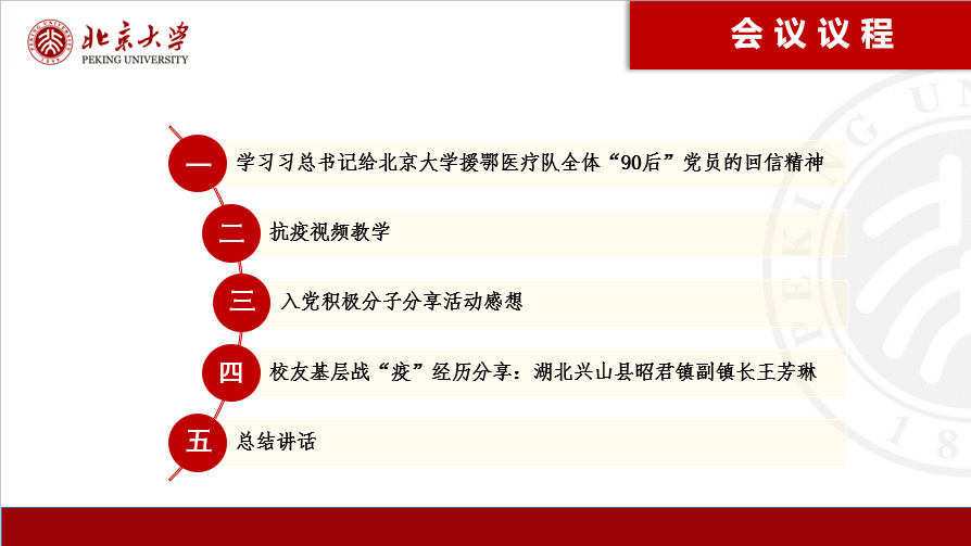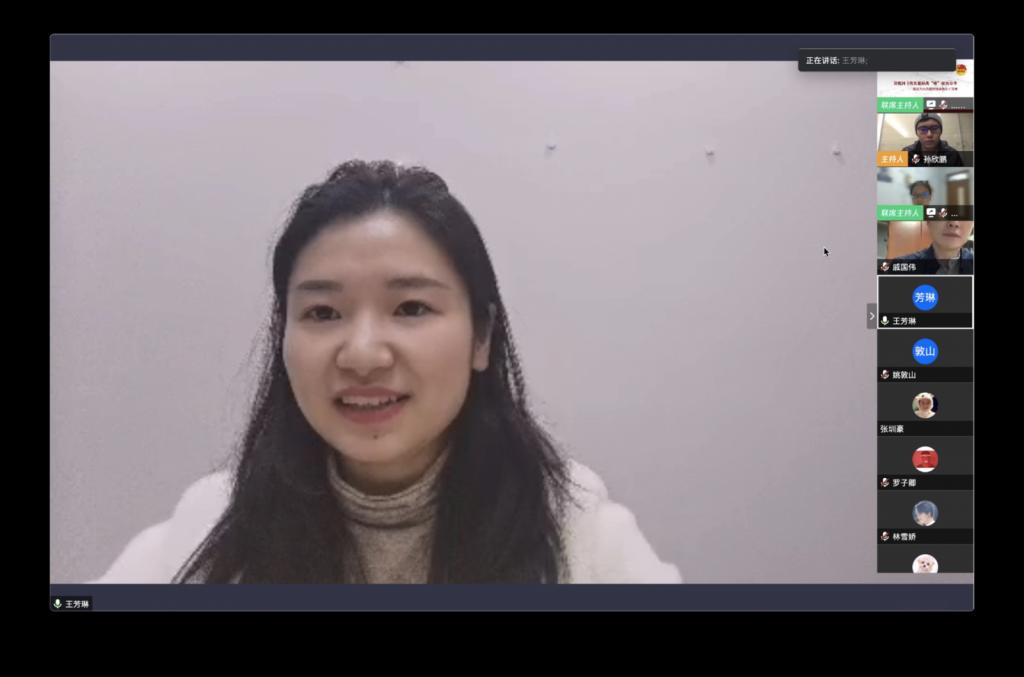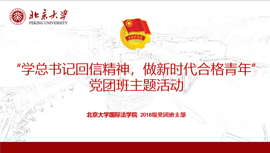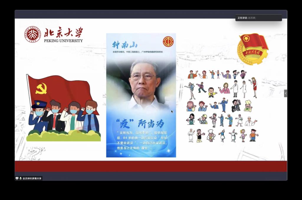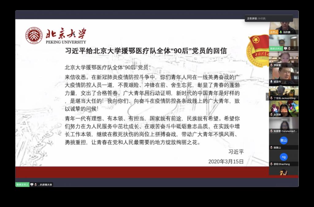活动由团支部书记苏建欣主持,活动主要分为五个环节:第一部分大家一起学习习近平总书记给北京大学援鄂医疗队全体“90 后”党员的回信;第二部分观看抗疫视频;第三部分为入党积极分子分享感想,第四部分邀请国际法学院的学姐,现任湖北兴山县昭君镇副镇长王芳琳分享校友基层战“疫”经历;最后由戚老师做总结发言。