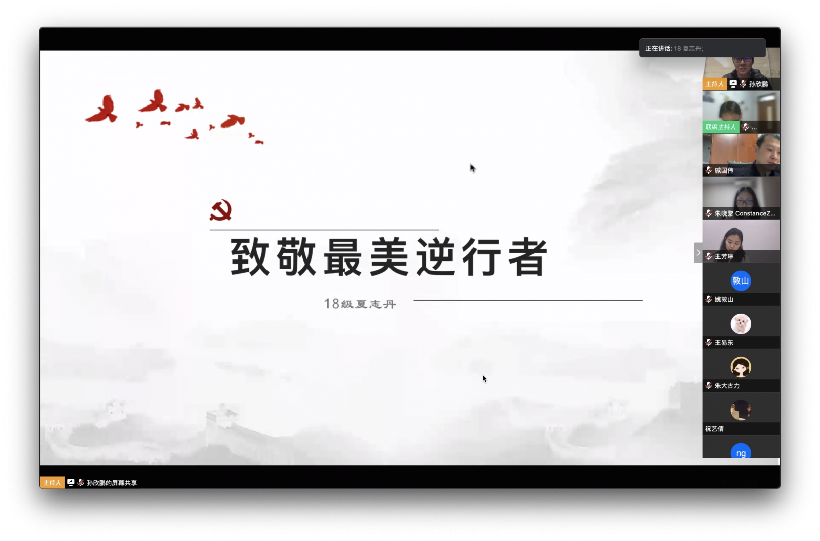 4月6日晚,为学习习近平总书记给北京大学援鄂医疗队全体“90后”党员的回信精神,国际法学院2018级党团班支部开展了线上党团班主题活动。活动邀请到了党委副书记、国法2018级法律硕士班第二班主任戚国伟老师,国法2018级法律硕士班第一班主任朱晓黎老师,国法学工老师曾柯潞老师,共有120余人参与会议。