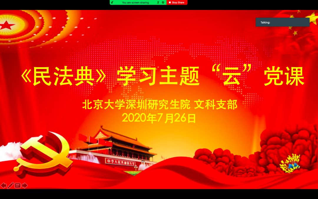 2020年5月28日,十三届全国人大三次会议表决通过了《中华人民共和国民法典》,这是我国第一部以“典”命名的法律,是新时代我国社会主义法治建设的重大成果。在此背景下,2020年7月27日,北京大学深圳研究生院文科党支部联合北京大学国际法学院(STL)学生党支部举办《中华人民共和国民法典》学习主题“云党课”。党课由我院助理教授、北京大学深圳研究生院文科党支部书记曹斐主持,茅少伟助理教授受邀主讲,文科党支部和STL学生党支部的党员参与讨论。