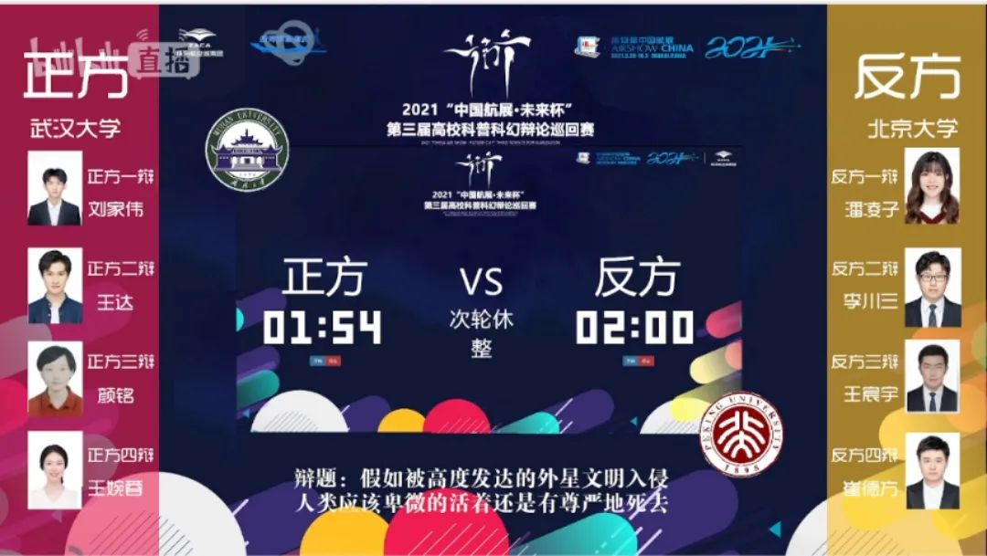 潘凌子(国际关系学院)、李川三(法学院)、王宸宇与崔德方(元培学院)四位辩手在决赛轮代表北京大学出战,就“假如被高度发达的外星文明入侵,人类应该卑微地活着/有尊严地死去”这一议题与武汉大学队进行辩论。