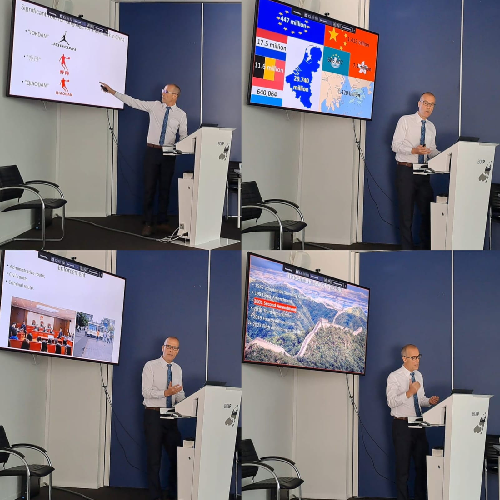 近日,Friedmann教授应比荷卢(比利时,荷兰,卢森堡)知识产权局(BOIP)副局长Hugues Derème先生的邀请,于2023年5月2日在荷兰海牙的比荷卢知识产权局就“具有中国特色的商标法”发表演讲。在介绍了北京大学国际法学院(英文简称“STL”)的概况后,Friedmann教授概述了1982年中国《商标法》以及1993年、2001年、2013年和2019年修正案的一些最重要的条款,并对2023年1月的中国《商标法》第五修正案草案进行了详细介绍。随后,Friedmann教授分别分析了迈克尔·乔丹(Michael Jordan)和爱马仕(Hermès)案件,就翻译、汉字转录、拼音转录和混合体等特殊的中文语言问题对外国公司的重要性发表了自己的看法。最后,Friedmann教授强调了“非传统”三维商标在非语言区的优势。