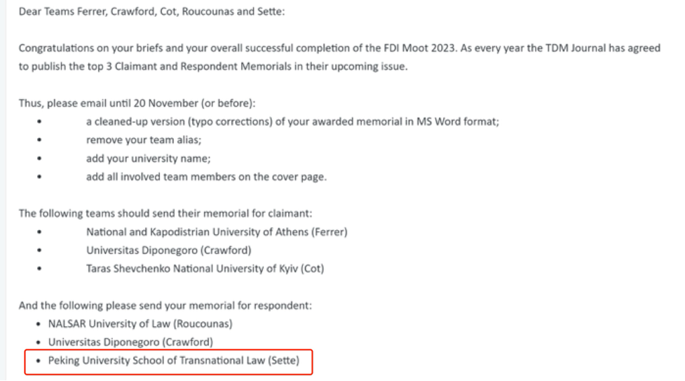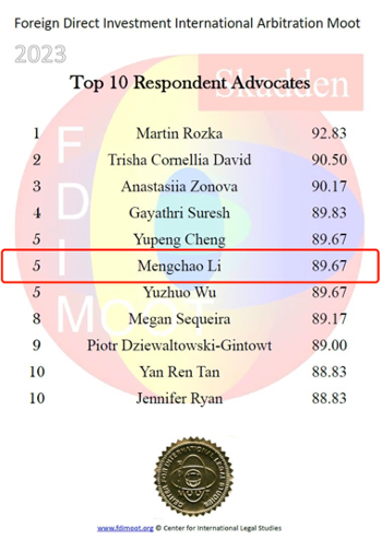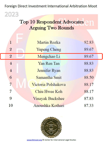 2023年11月2日至11月5日,第十六届“国际投资仲裁模拟法庭竞赛”(2023 Foreign Direct Investment International Arbitration Moot,简称FDI Moot 2023)通过线上线下(印度勒克瑙)结合方式举行。北京大学国际法学院(STL)代表队总成绩位列全球第17名、中国赛队第2名,李梦超同学、徐越方洲同学获得全球“最佳辩手”称号(Best Advocates)。其中,李梦超同学位列全球最佳辩手第15名,并获得Respondent方十佳辩手称号(Top 10 Respondent Best Advocates)。此外,STL赛队撰写的Respondent方书状排名全球第3名,该书状即将刊登于国际知名期刊《跨国纠纷管理》(Transnational Dispute Management Journal)。