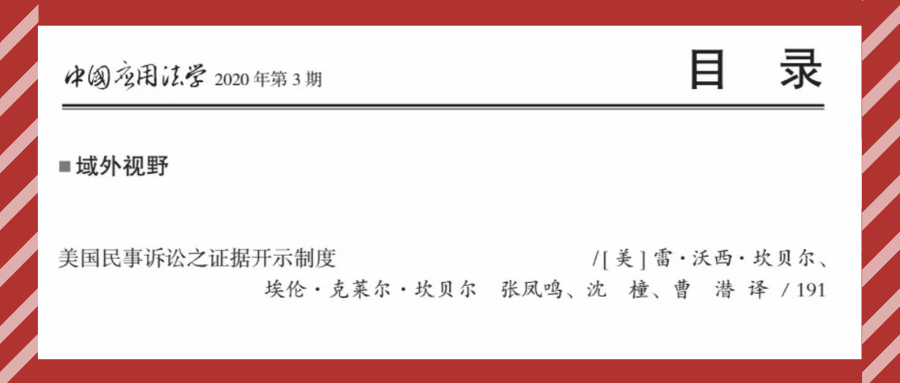 近日,Ray Campbell教授的文章《美国民事诉讼之证据开示制度》在《中国应用法学》2020年第3期上发表。该文章由Ray Campbell教授和Ellen Campbell女士合作完成,由我院学生张凤鸣、沈橦、曹潜共同进行摘要翻译。 文章...