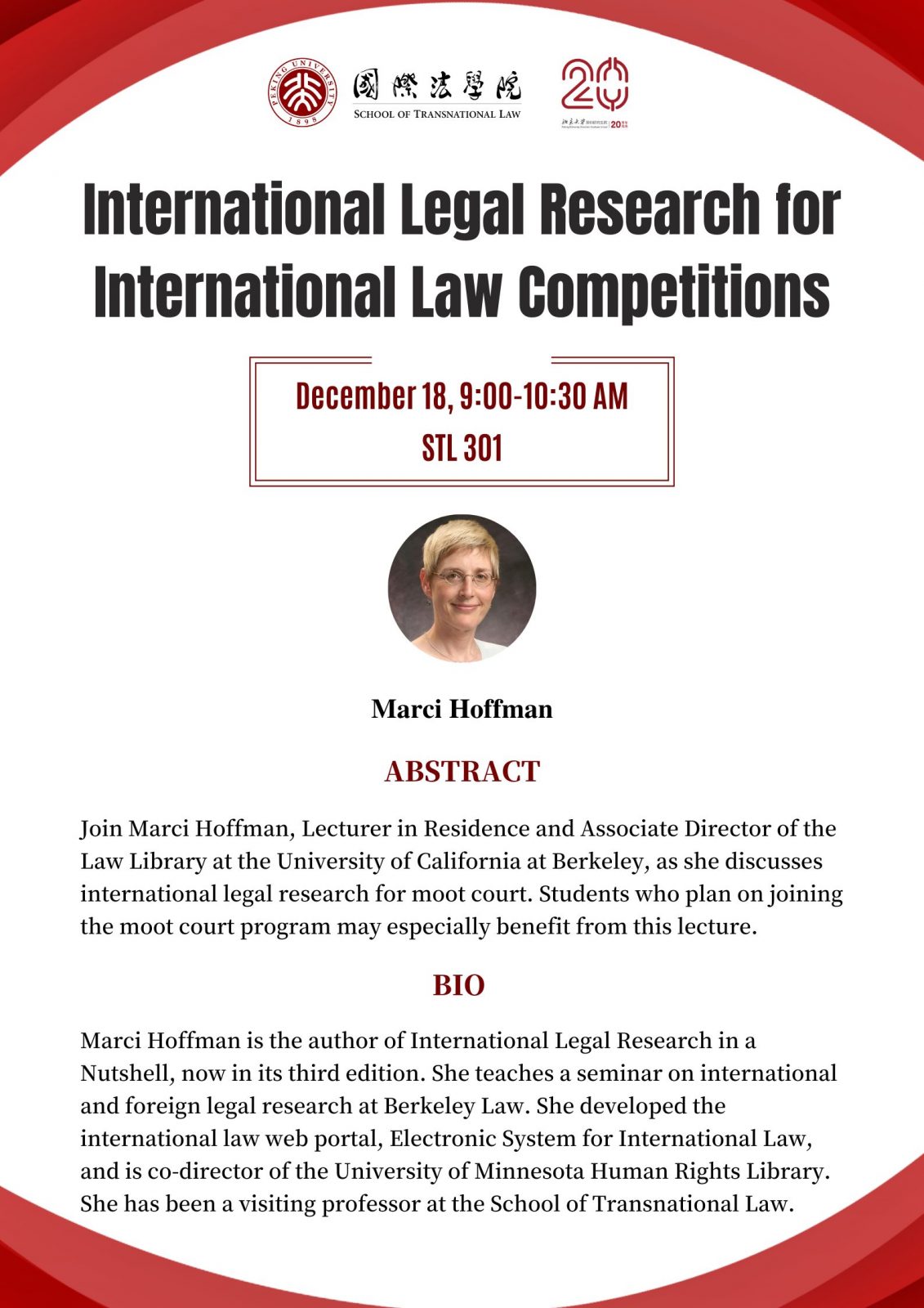 Marci Hoffman is the author of International Legal Research in a Nutshell, now in its third edition. She teaches a seminar on international and foreign legal research at Berkeley Law. She developed the international law web portal, Electronic System for International Law, and is co-director of the University of Minnesota Human Rights Library. She has been a visiting professor at the School of Transnational Law.