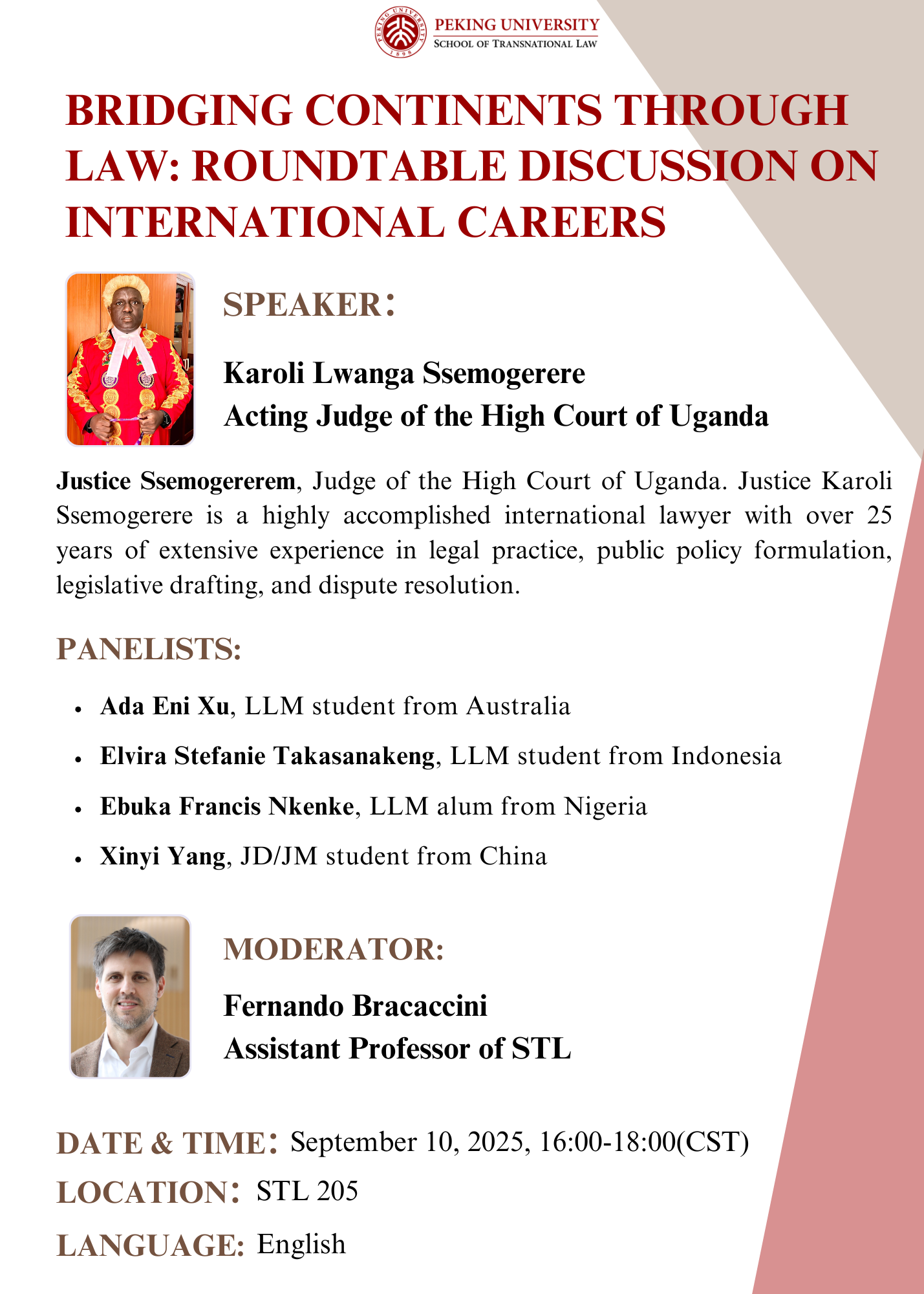 9月10日,由北京大学国际法学院(英文简称“STL”)国际项目办公室主办的圆桌讨论活动将在国法205教室举办。本期主题为“Bridging Continents through Law: Roundtable Discussion on International Careers”,欢迎感兴趣的师生积极参与。活动具体信息如下: