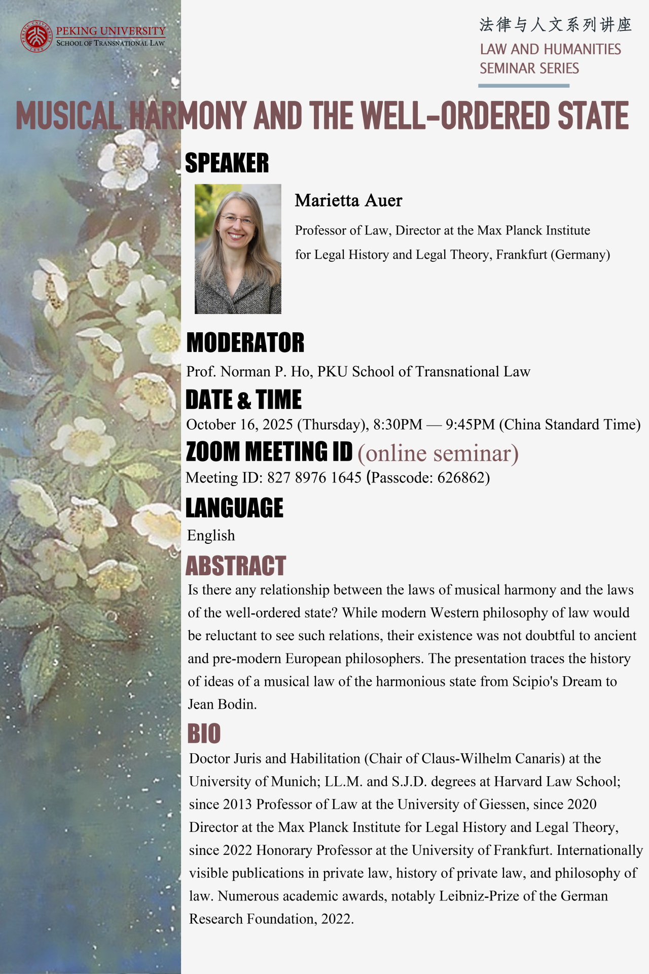 10月16日,北京大学国际法学院(英文简称“STL”)公开讲座“Musical Harmony and the Well-Ordered State”将于Zoom平台举行,欢迎感兴趣的师生积极到场参加!具体信息如下: