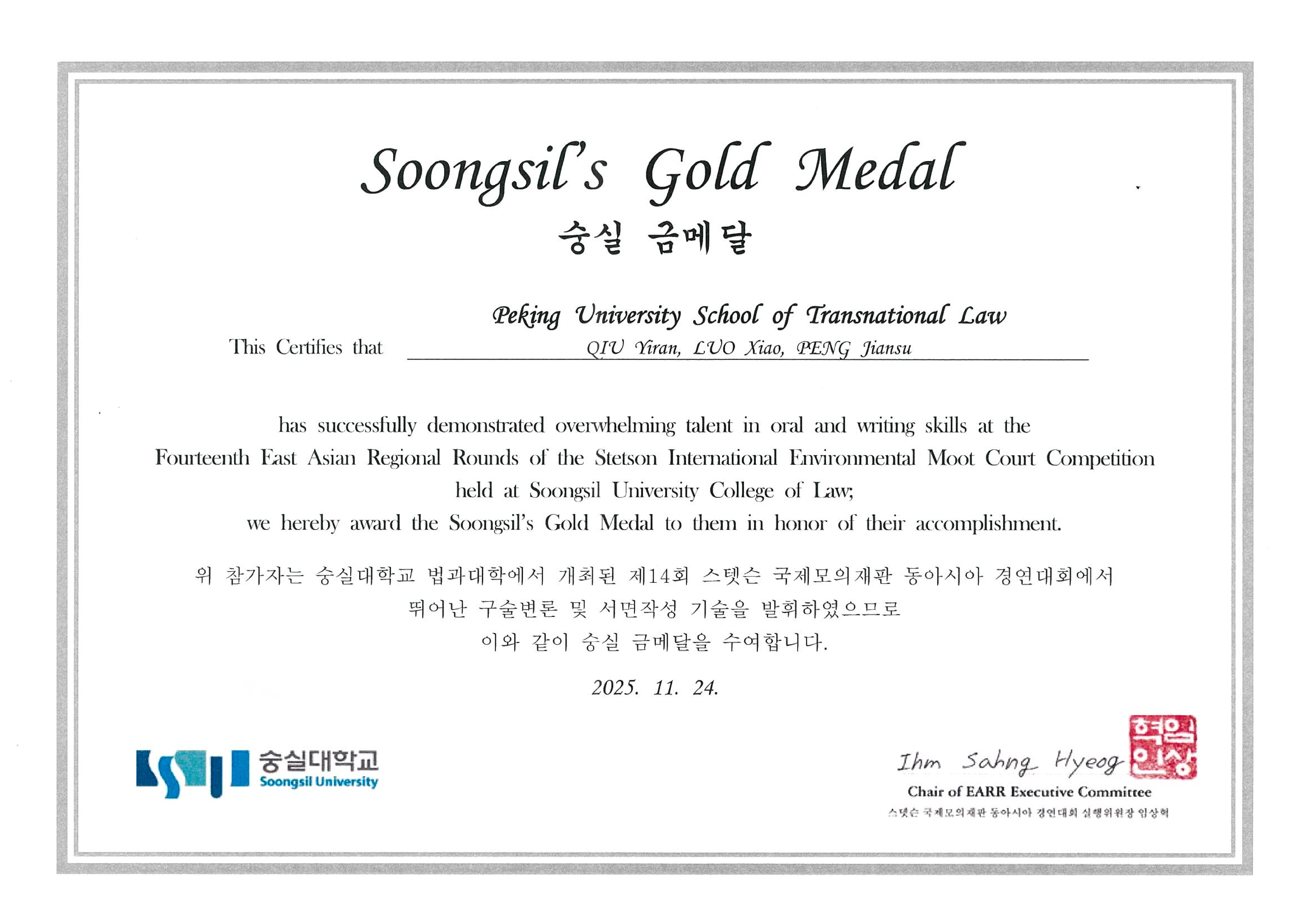 From November 20 to 24, 2025, the 14th Stetson International Environmental Moot Court Competition (IEMCC) East Asian Regional Rounds (EARR) were held at Soongsil University in Seoul, South Korea. Conducted entirely in English, the competition brought together leading law school teams from China, South Korea, Japan, Italy, Mongolia, and other countries and regions. Amid intense competition, the STL team delivered an outstanding performance and ultimately won the Soongsil’s Gold Medal, successfully qualifying for the International Finals. Luo Xiao received the First Oralist Award; Peng Jiansu was awarded the Second Oralist Award and the Best Oralist Award in Final Round; and Qiu Yiran received the Third Oralist Award.