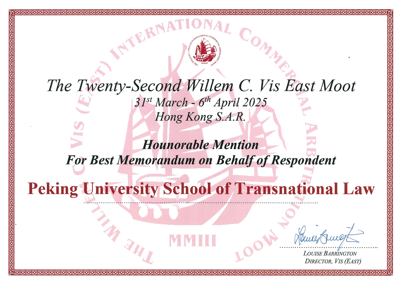 From March 30 to April 6, 2025, the 22nd Willem C. Vis (East) International Commercial Arbitration Moot Court Competition was successfully held in Hong Kong, China. In this competition, the team representing our school won the Honorable Mention for Best Memorandum on Behalf of Respondent.