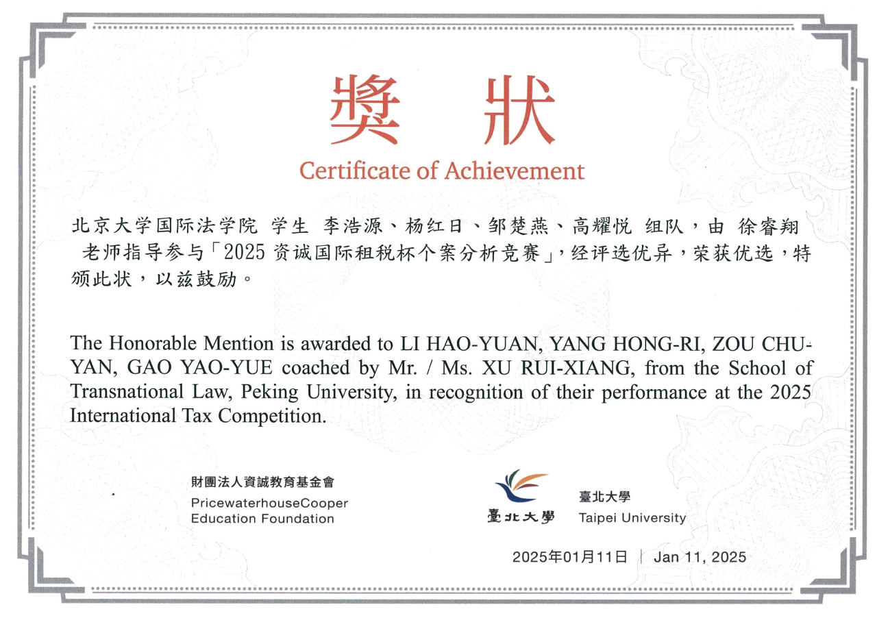 On January 11, 2025, the 2025 International Tax Competition concluded. This year’s competition centered on the theme “Multinational Enterprise Supply Chain Transformation and Tax Governance under Pillar Two”, adopting a preliminary-final round format. The preliminary round was conducted online from October 8 to November 14, with participating teams analyzing designated case studies. The School of Transnational Law, Peking University representative team demonstrated exceptional performance in the finals, earning the Honorable Mention.