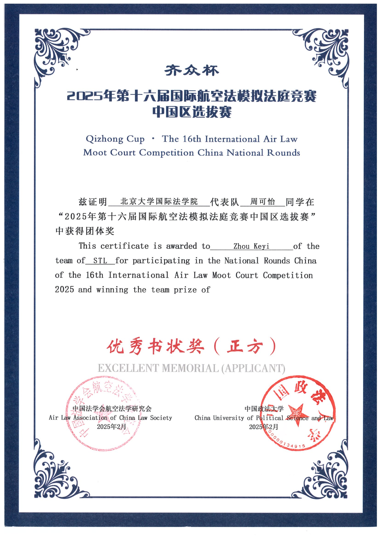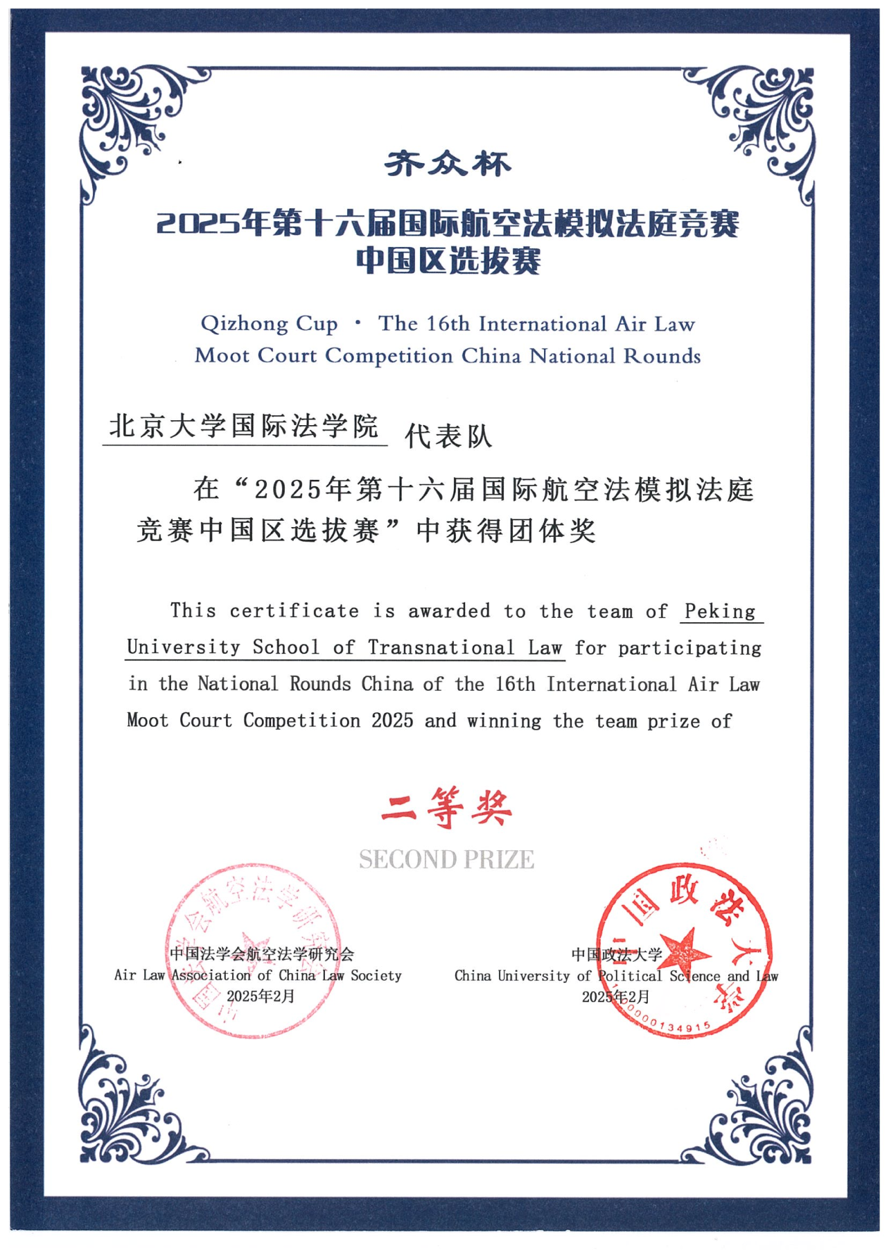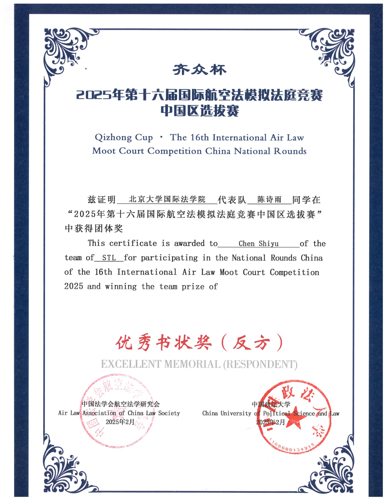 From February 22 to 23, 2025, the 16th International Air Law Moot Court Competition, China Regional Selection was successfully held in Datong, Shanxi Province. This marked the second time that STL has participated in the international air law moot court competition. After intense competition, the team representing our school delivered an outstanding performance, winning the National Second Prize, the Excellent Oral Presentation (Applicant Side), as well as the Excellent Memorial Award (both Applicant and Respondent Sides).