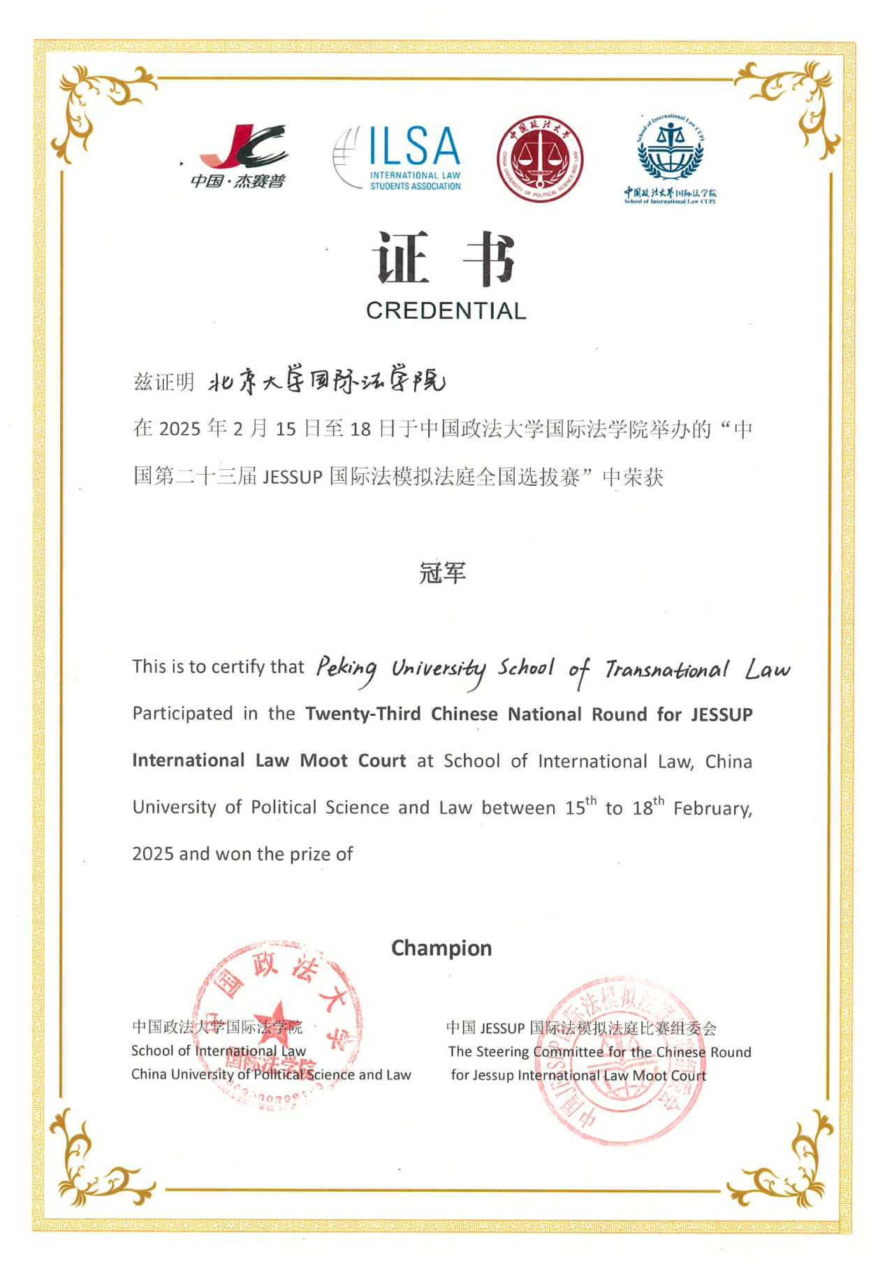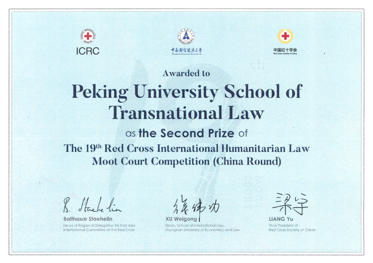 The School of Transnational Law, Peking University representative team was coached by Xu Ruixiang. Team members included Li Haoyuan, Yang Hongri from the Class of 2022, Zou Chuyan, and Gao Yaoyue from the Class of 2023.
