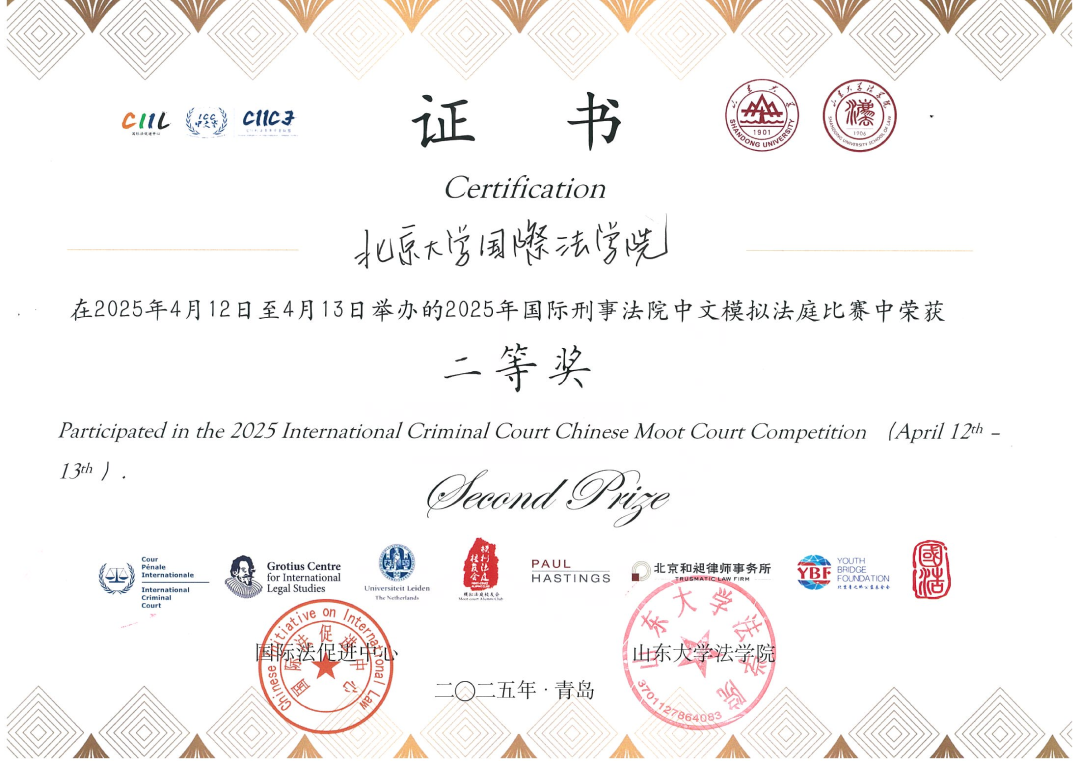 Shortly thereafter, from April 11 to 13, the 2025 ICC Chinese Moot Court Competition took place at Shandong University (Qingdao Campus). With a record-high scale, the competition attracted 105 top universities nationwide, including Tsinghua University, Peking University, and Sun Yat-sen University. Our school's delegation showcased outstanding professional competence in both the written submission competition and court debates, standing out among over a hundred strong teams. They finally ranked 14th nationwide and secured the second place in the Second Prize category, thus being awarded the National Second Prize.