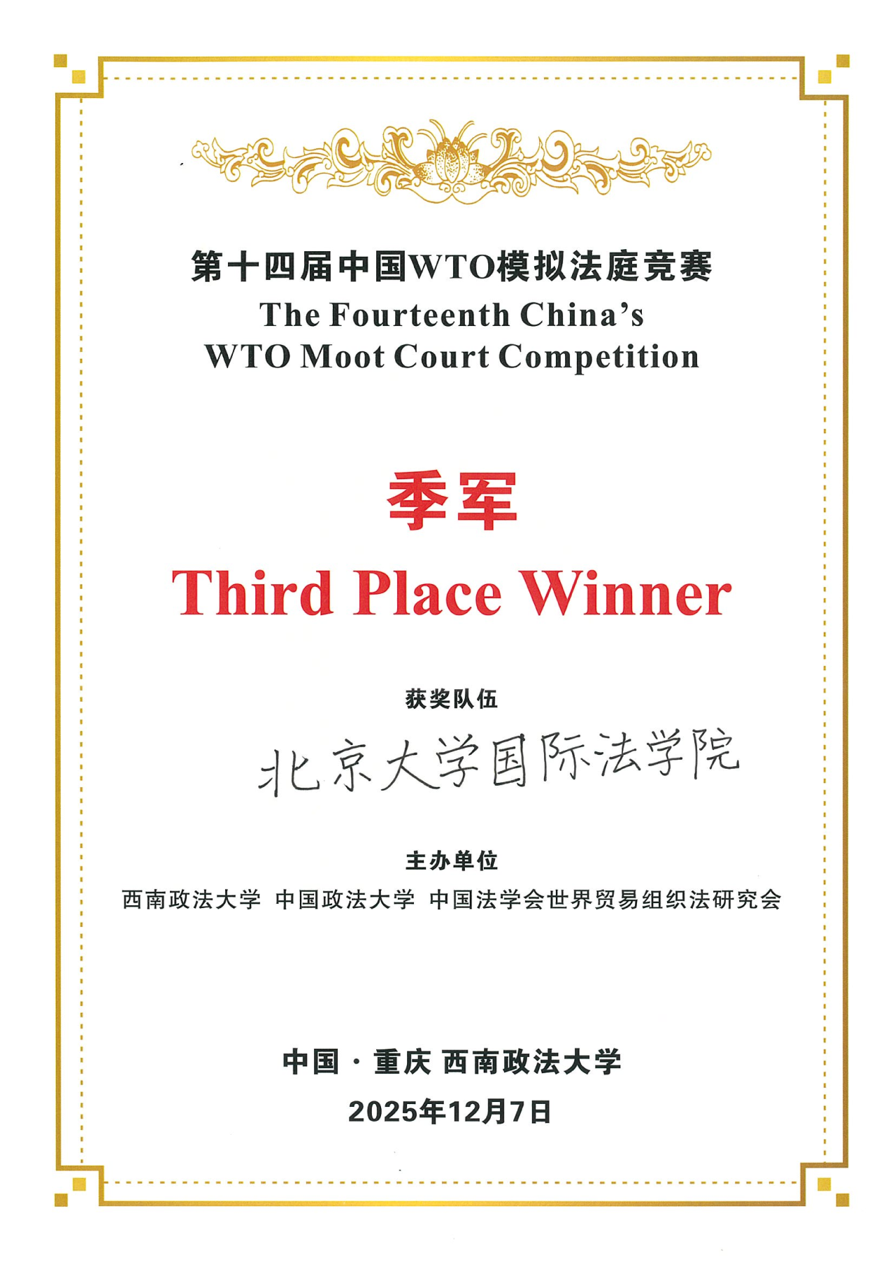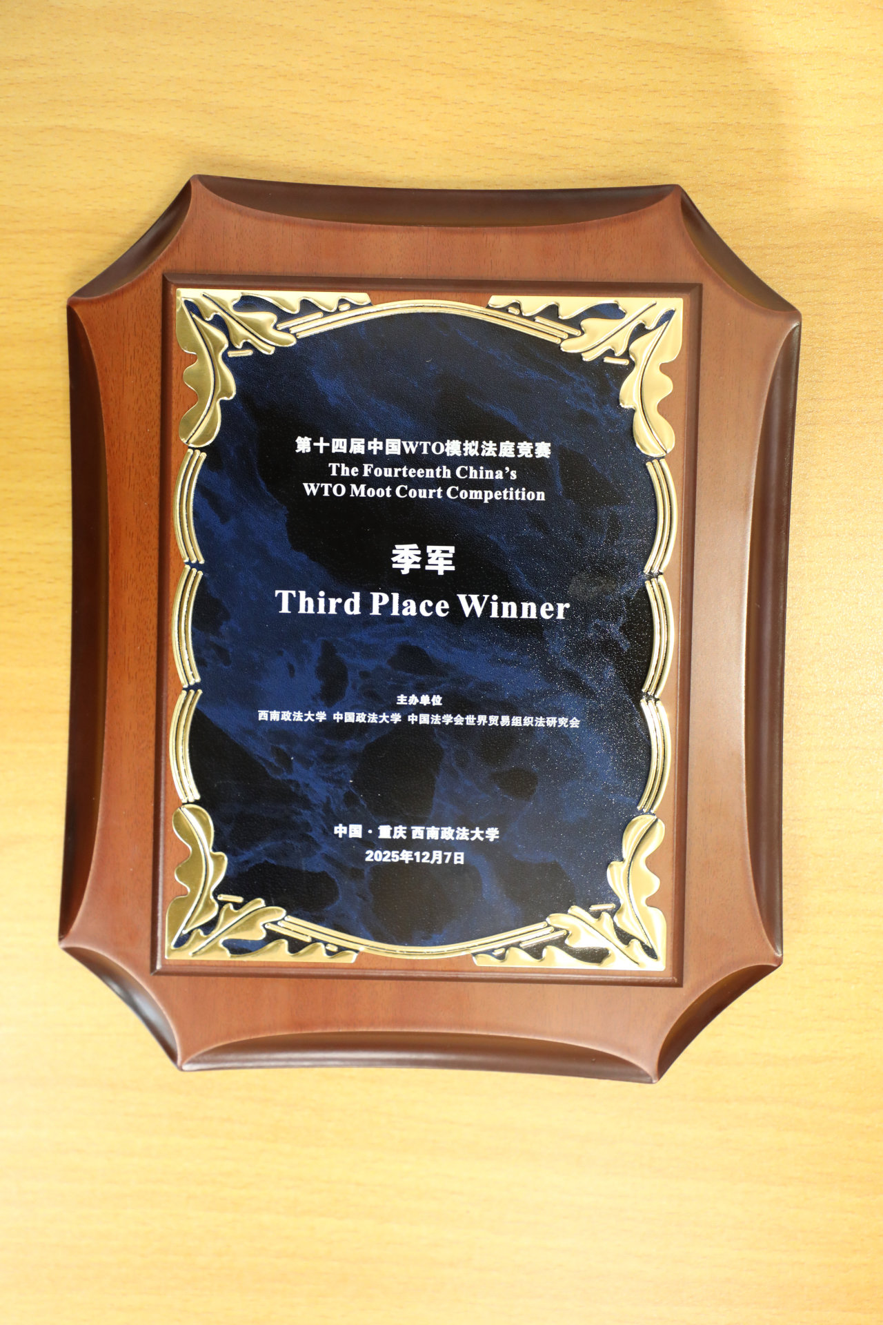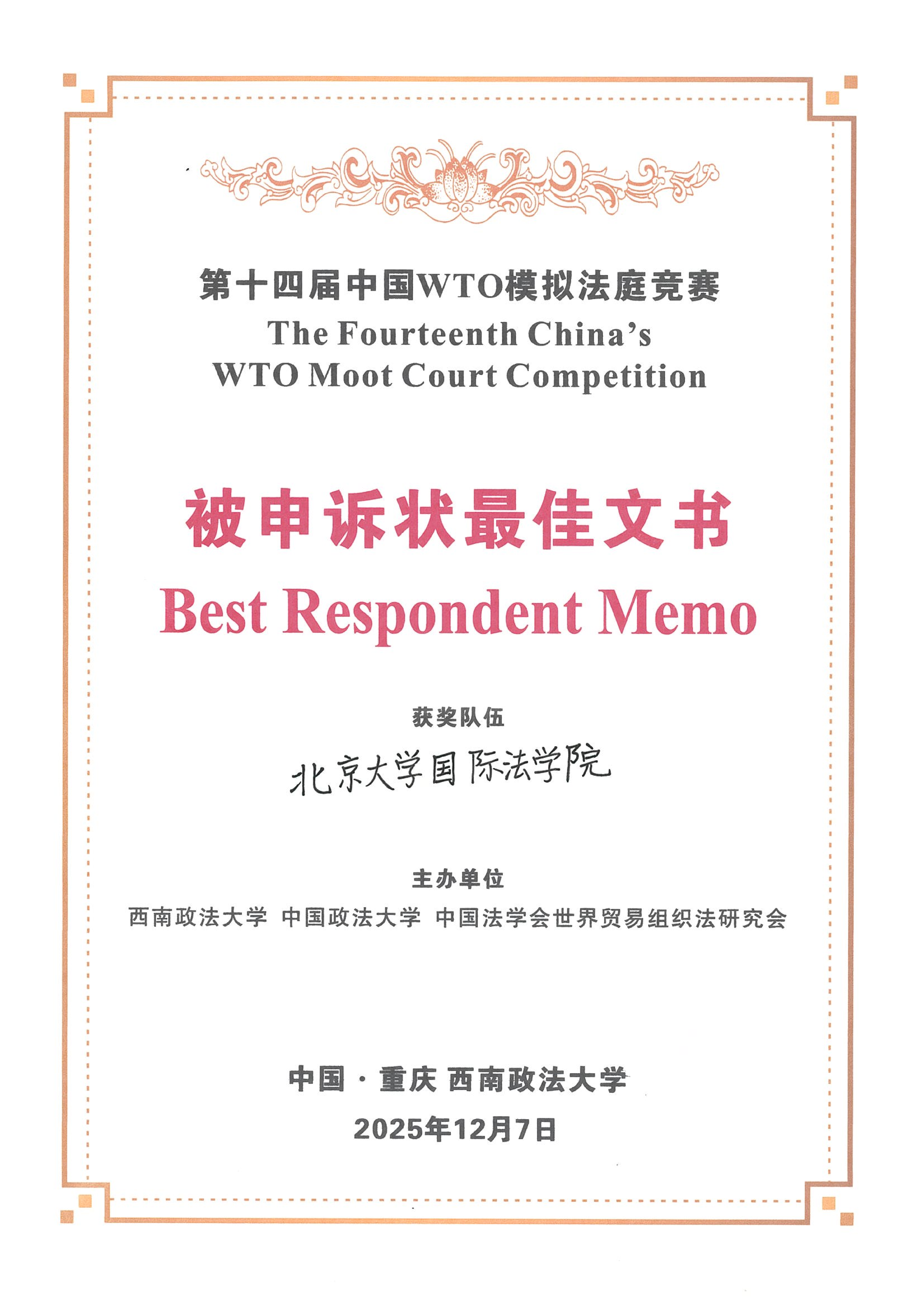 On December 7, 2025, the 14th China WTO Moot Court Competition concluded successfully at Southwest University of Political Science and Law. The STL team overcame numerous challenges and ultimately stood out amid intense competition, securing the national third place, the first prize for the team, the Best Respondent Memorial Award (the sole highest score), and the third prize for the Complainant Memorial. Team member Ma Yiyan was honored as the Best Oralist for the Complainant in the preliminary rounds and the Best Overall Oralist in the preliminary rounds. The team’s advisor, Bin Dong, received the Best Coach Award.