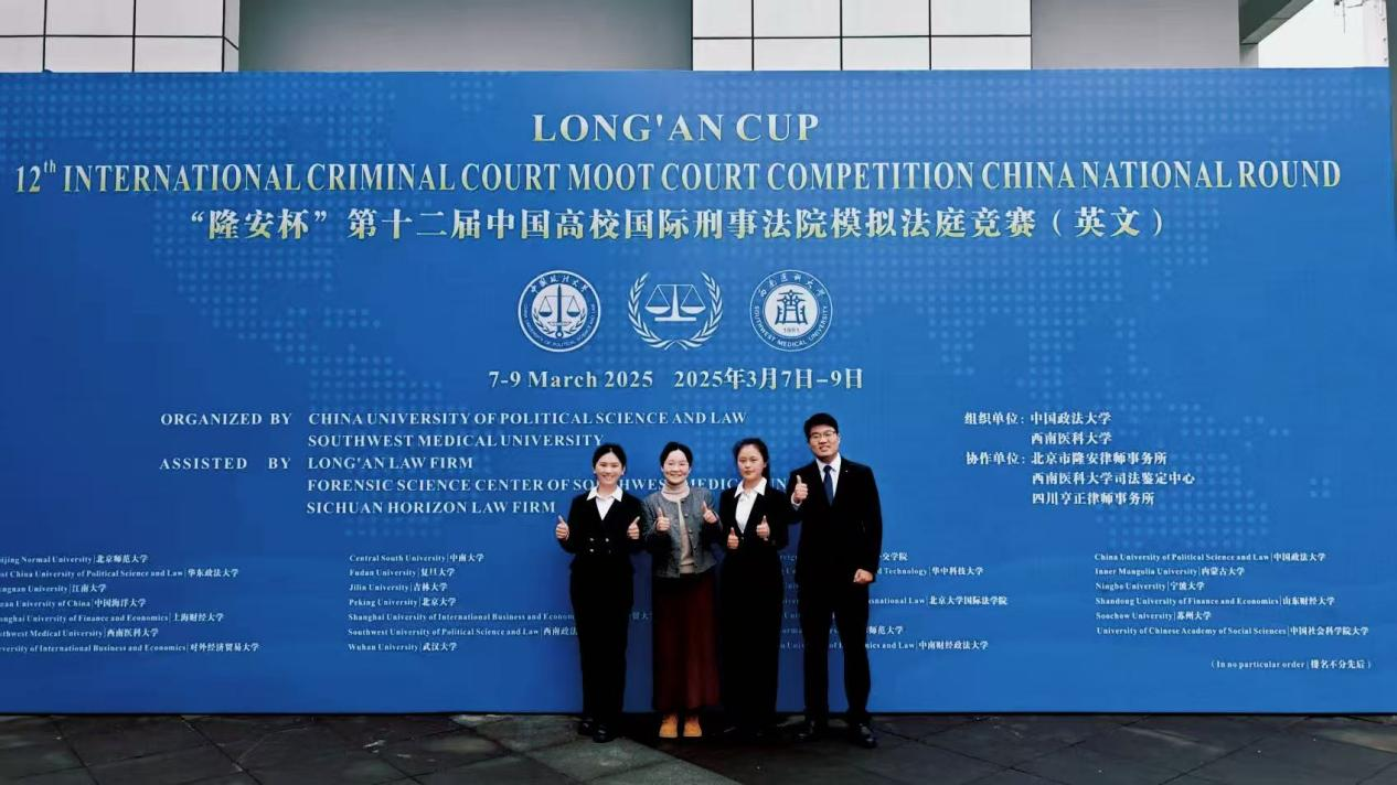 From March 8 to 9, 2025, the 12th China University International Criminal Court (ICC) Moot Court Competition, was held at Southwest Medical University. Competing against 62 participating teams from across the country, the delegation from our school demonstrated rigorous logic and precise expression during the court debates, ultimately winning the First Prize at the national level and securing the Best Defense Counsel Award in the preliminary round.