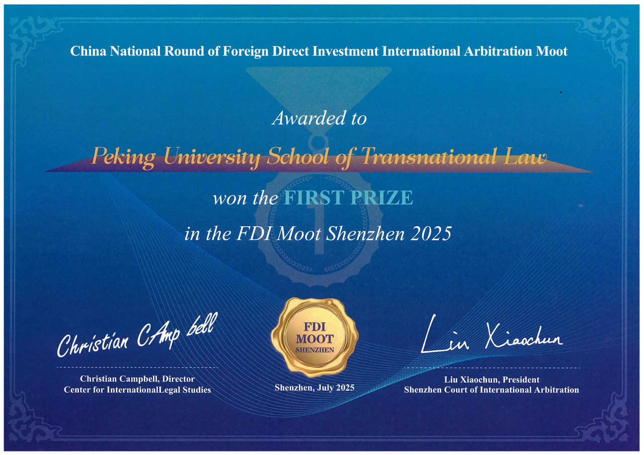 Before the FDI Moot, the team also participated in the 17th Frankfurt Investment Arbitration Moot Court Competition (China Regional Round) and won Second Prize. Yang Yahan and Shao Ziheng were named Best Oralists for the preliminary round, and Yao Ruiyang received the Outstanding Contribution Award. For this year’s Frankfurt and FDI team, Qiu Xiaoya, Director of the Office of International Cooperation, served as faculty advisor. Student coaches were Shu Xi, Wei Tianshu, Li Haoyuan, and Yang Liuqing (Class of 2022). Team members included Yao Ruiyang, Yang Yahan, Shao Ziheng, and Li Haobin (Class of 2023). Special thanks go to Executive Dean Mark Feldman, Assistant Professor Kevin Gray, Senior C.V. Starr Lecturers Jiang Zichen and Wang Ding, as well as alumni including Attorney Gu Dai and Attorney Liu Dingmin, and members of the STL Moot Family, including but not limited to Li Anhua and Xing Jiabao (Class of 2021), Peng Junkai (Class of 2022), Tang Luyang (Class of 2023), and Qiu Yiran and Peng Jiansu (Class of 2024)—for their invaluable advice and guidance.